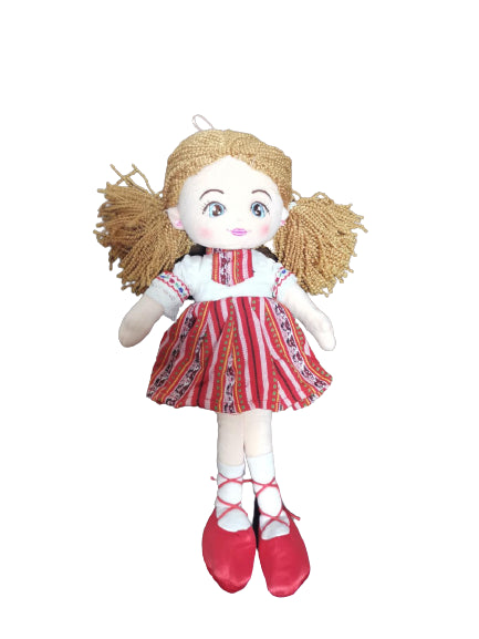 Papusa are rochita traditionala cu imprimeu motive nationale , 2 codita prinse cu flori , cercei si opincuite .